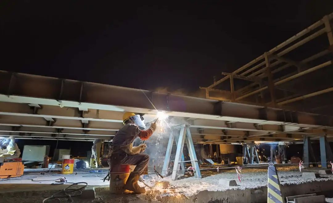 伊拉(lā)克九區原油中央處(chù)理設施項目(mù)結構焊工(gōng)賈鵬飛加班進行(háng)撬座底板焊接,保證設備到場能夠(gòu)順利(lì)安裝(zhuāng)