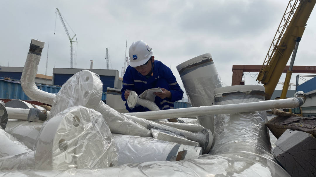 青島海油項目趙翀正在進行管線到貨狀態檢查,管線反(fǎn)號記錄