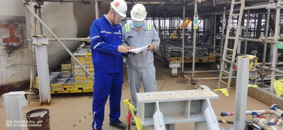 青(qīng)島武麥場地(dì)Scarborough項目馬克升在(zài)模塊一層高壓燃氣加(jiā)熱(rè)器設備底(dǐ)座鑽孔位置與業主PE現場複核(hé)